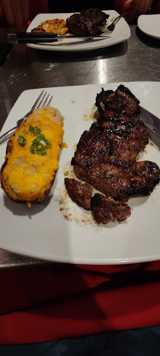 To begin with this was our first experience at the Venice location. We usually go to Port Charlotte. We always arrive early in order to sit at the bar. Our bartender, Kim, was immediately attentive, and was outstanding throughout. The steaks we ordered, a petite filet and a strip steak were excellent. Cooked to medium rare for both. Her mashed potatoes were "fine". My potatoes au gratin were slightly al dente, and definitely under sauced. My biggest complaint was with the compliment order of Lobster Crusted for both steaks. The order arrived and atop both steaks was a scoop of reddish bread crumbs. After breaking it apart there was scant evidence of any lobster to be had. It was also overly salted. We pushed the compliment to the side of our plate and enjoyed our delicious steaks. Decent happy hour pricing on tap beer and select wines. And returning to Kim, she noticed that we barely touched the breadcrumbs and very graciously took it off our final tab. The restaurant has a modern vibe, and I must say the wine rack by the entrance is impressive. I just like the classic steak house look in Port Charlotte.